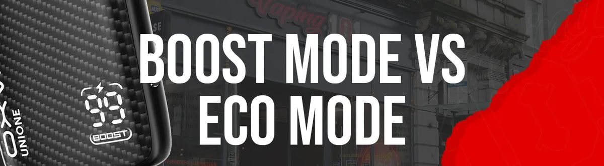 Boost mode increases power output for a warmer vape with more vapour and stronger flavour. Eco mode reduces output to extend battery life and produces a lighter, cooler draw. Coming from a disposable vape, start on Eco and increase to Boost if you want more intensity.