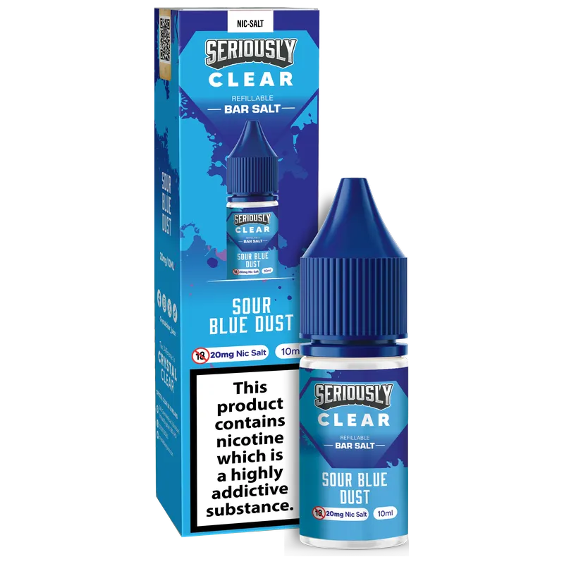 Sour Blue Dust nic salt e-liquid by Seriously Clear Bar Salt brings a confectionery-style vape that blends sugary candy sweetness with sharp, zingy blue raspberry. Part of the bold Seriously Clear Bar Salt range, it’s designed for smooth, satisfying MTL sessions with strong flavour at low wattage.
