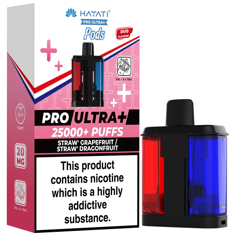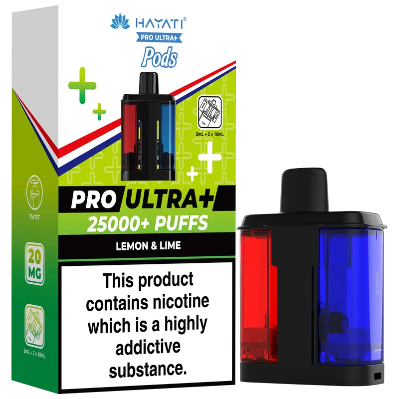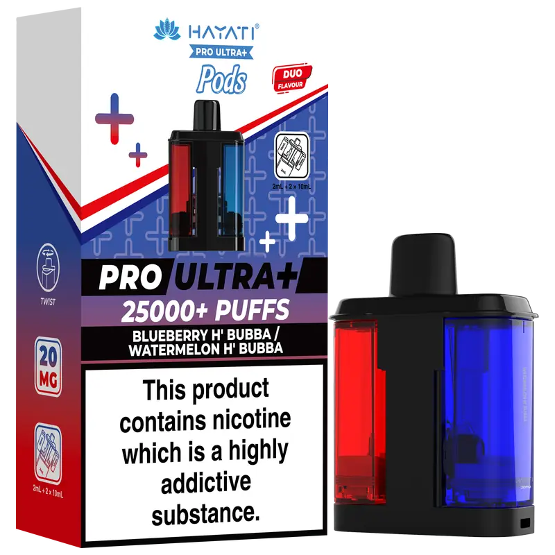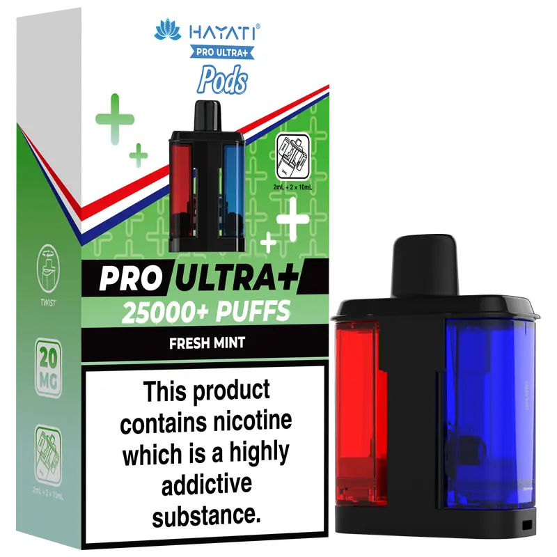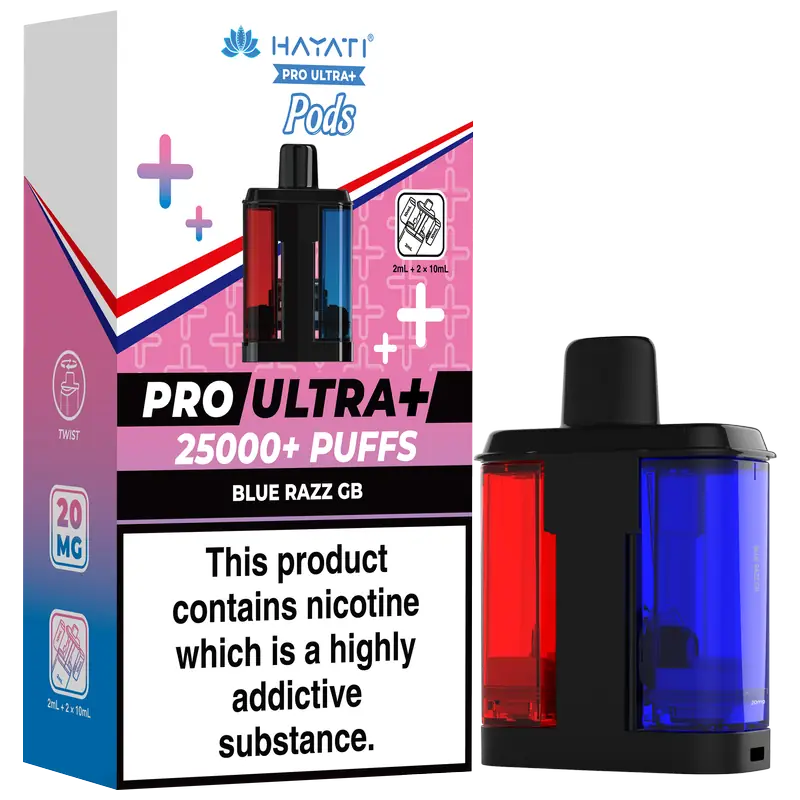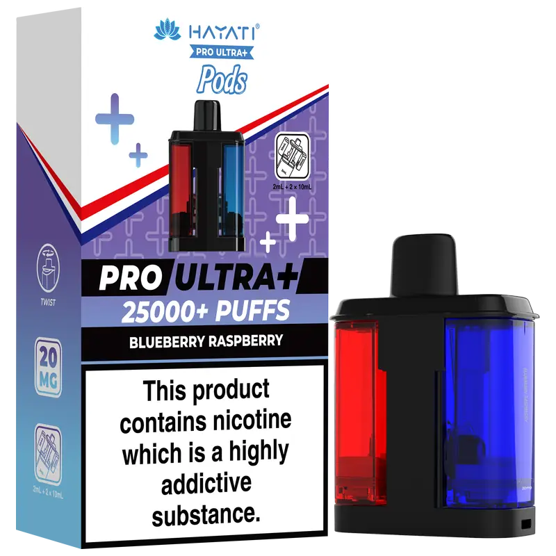- 2 × Hayati Pro Ultra+ 10 ml auto-refilling e-liquid tanks (20 mg nic salt)