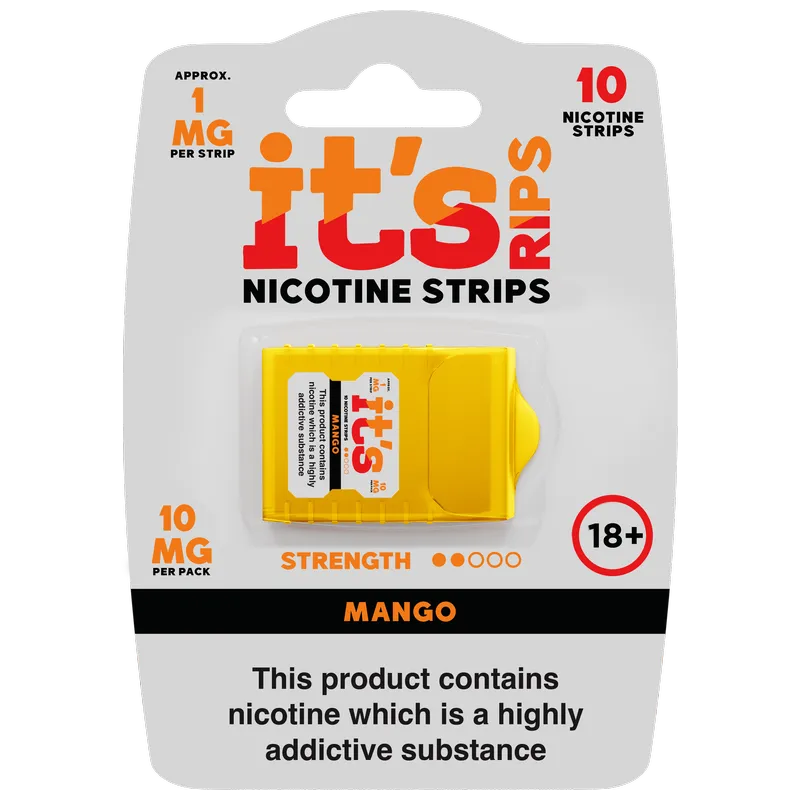 It’s RIPS Nicotine Strips - Mango are dissolvable nicotine strips designed to melt on your tongue, much like a mint strip, delivering a bold mango taste with a fast, discreet nicotine hit. Explore more from the [It’s collection] for additional flavours and strengths. Each pack contains 10 strips and comes in 0.5mg or 1.0mg per strip options, making it easy to choose a lighter or stronger feel depending on your preference.