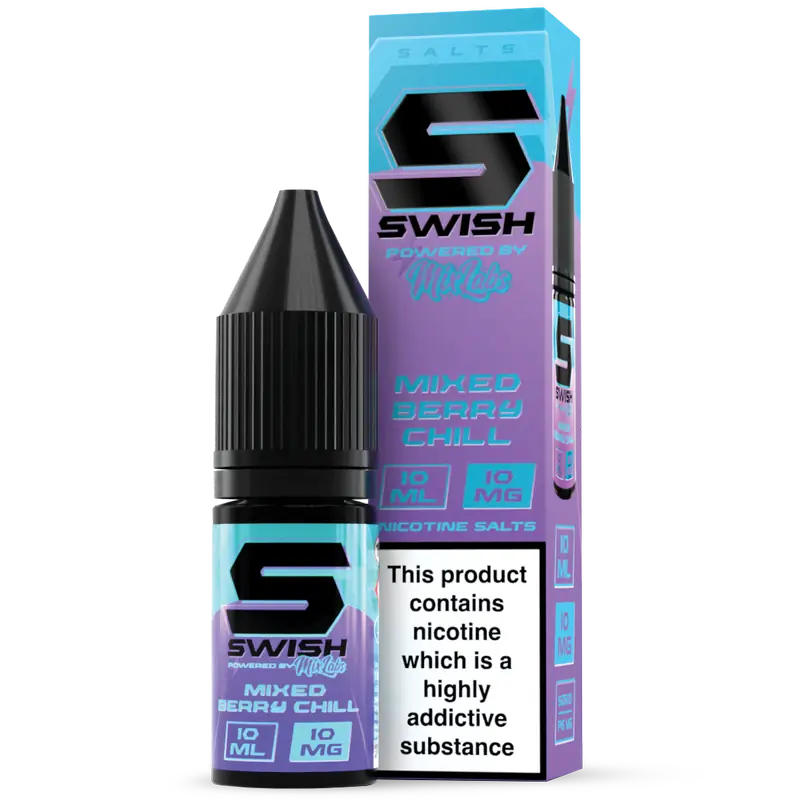 Swish X Mix Labs Mixed Berry Chill is a dark, juicy berry blend with a cooling finish, crafted in the 10ml nic salts range for smooth MTL vaping. It’s best in refillable pod kits, delivering rich flavour and quick nic satisfaction with a sleek, refreshing edge.