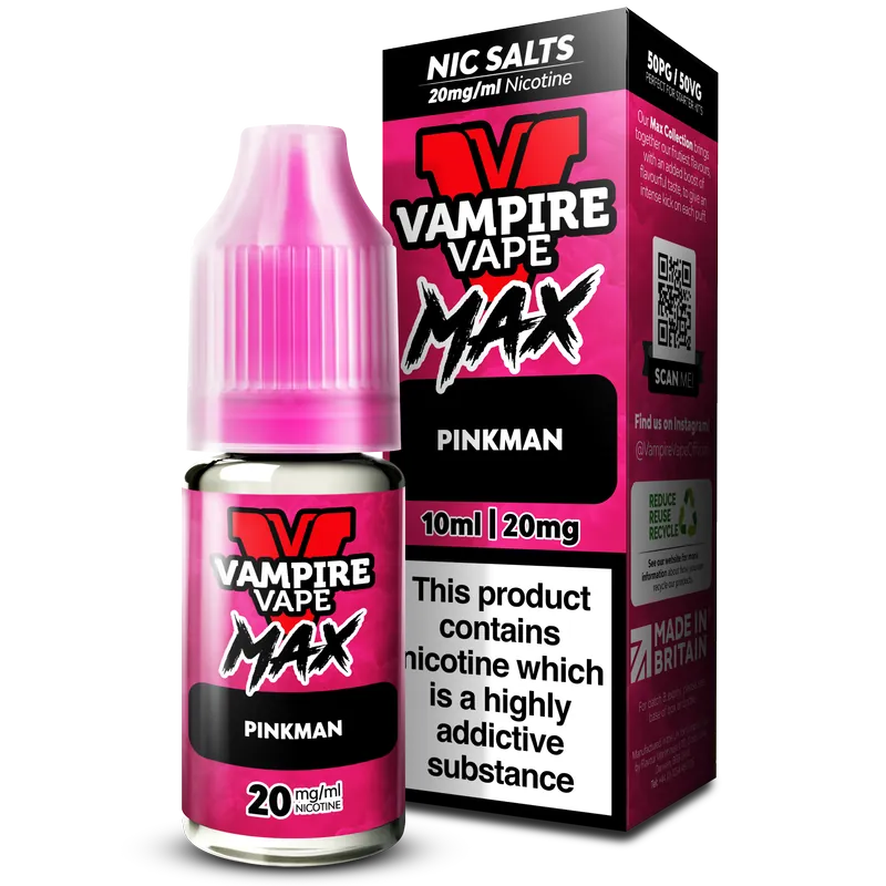 Buy Vampire Vape Max Nic Salt Pinkman from Vaping101 for fast UK delivery, excellent prices and a trusted retailer experience. This flavour is perfect for vapers who want a stronger take on a popular fruit blend in a smooth refillable nic salt format. For more bold flavour profiles, browse the disposable inspired juice collection.